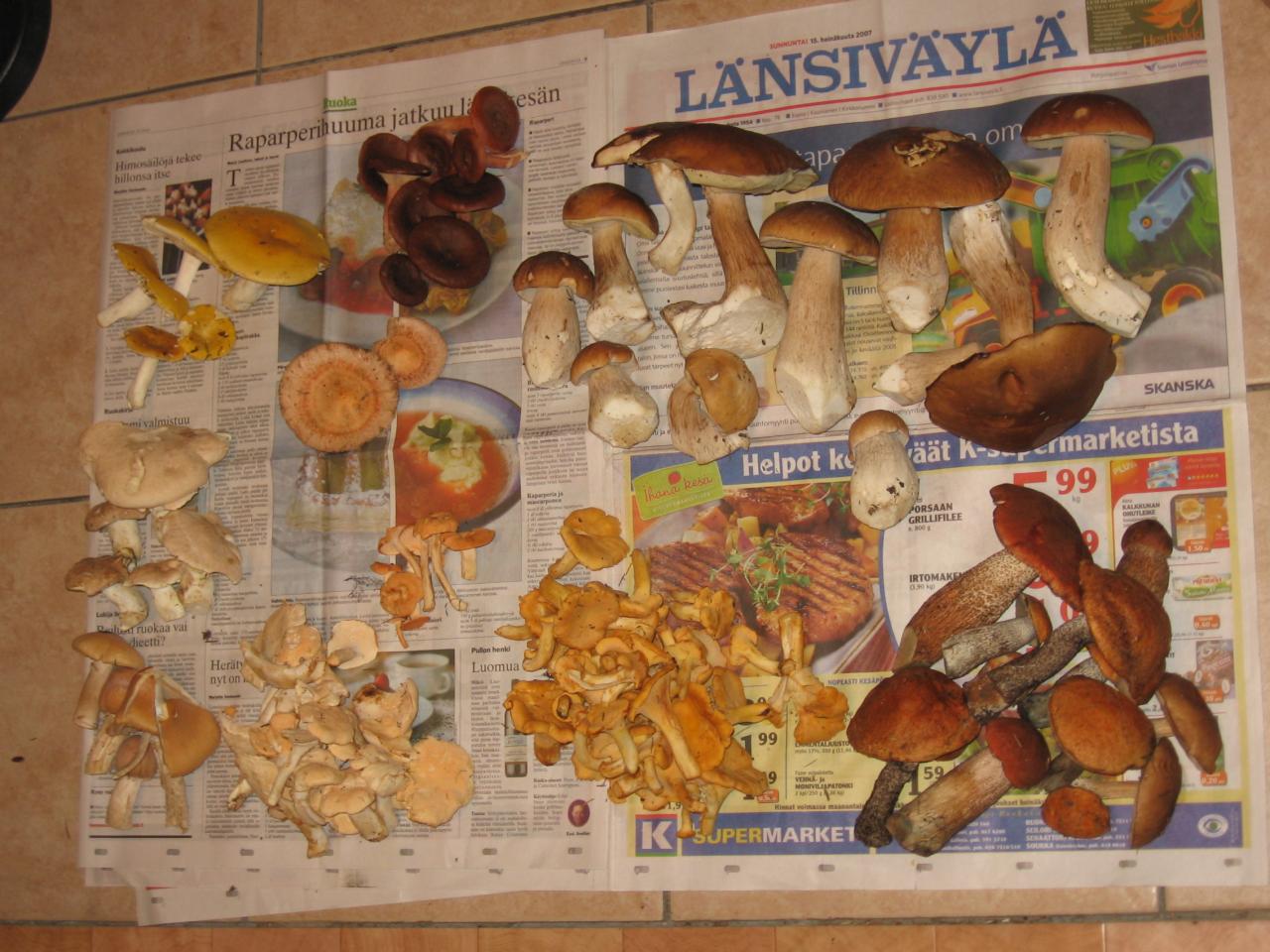 Kuvassa päivän lenkin saalis: koillisesta myötäpäivään lueteltuna herkkutatteja, (koivun)punikkitatteja, pari pientä lehmäntattia, kantarelleja, orakkaita (vaaleita ja ruskeita), kehnäsieniä, lampaankääpiä, keltahaperoita ja kangas- sekä karvarouskuja.