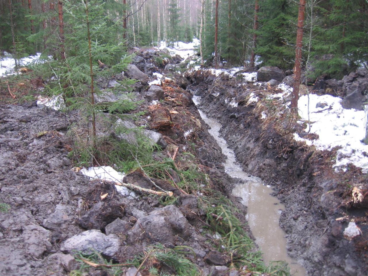 Alajuoksulla vanha laskuoja menee kivikon läpi. Syvennystä saatiin kuitenkin riittävästi.