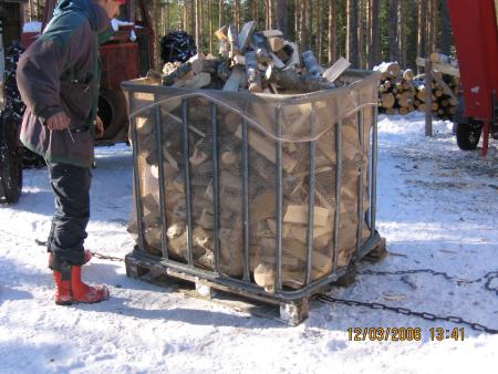 Polttopuiden tekoa klapisäkkeihin maaliskuussa 2006.