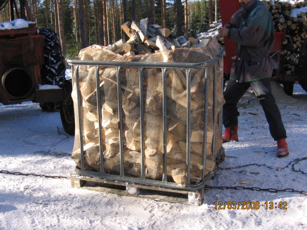 Polttopuiden tekoa klapisäkkeihin maaliskuussa 2006.