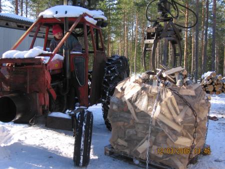 Polttopuiden tekoa klapisäkkeihin maaliskuussa 2006.