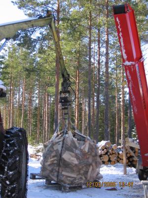 | Polttopuiden tekoa klapisäkkeihin maaliskuussa 2006. | |||