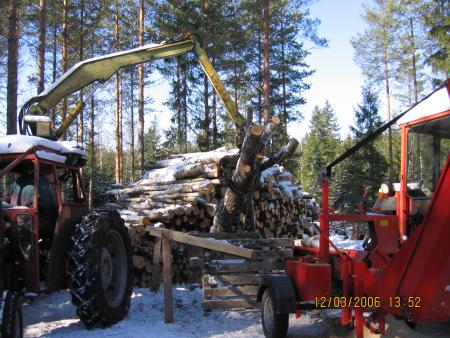 Polttopuiden tekoa klapisäkkeihin maaliskuussa 2006.