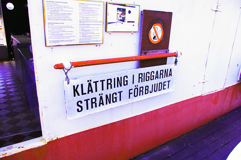 Pommerniin. Esitteiden mukaan alus on alkuperäiskunnossa, joten ihmetystä herätti, miten 26 hengen miehistö on selvinnyt työstään noudattaen kuvassa näkyvää alkuperäistä, takilaan kiipeämisen kieltävää kylttiä.