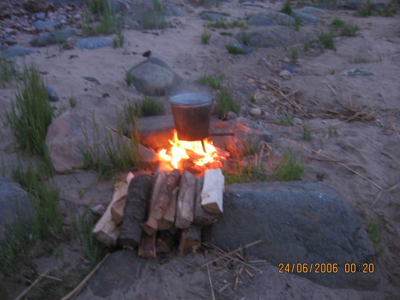Pesuvesi lämpiää teltan ulkopuolella muuripadassa.