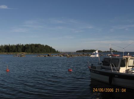 Taustalla saaristomaisemaa kaunistavat Tahkoluodon hiilivoimala ja Hyötytuulen tuulivoimala, joka hienotunteisesti oli juhannuspyhät pysäyksissä.
