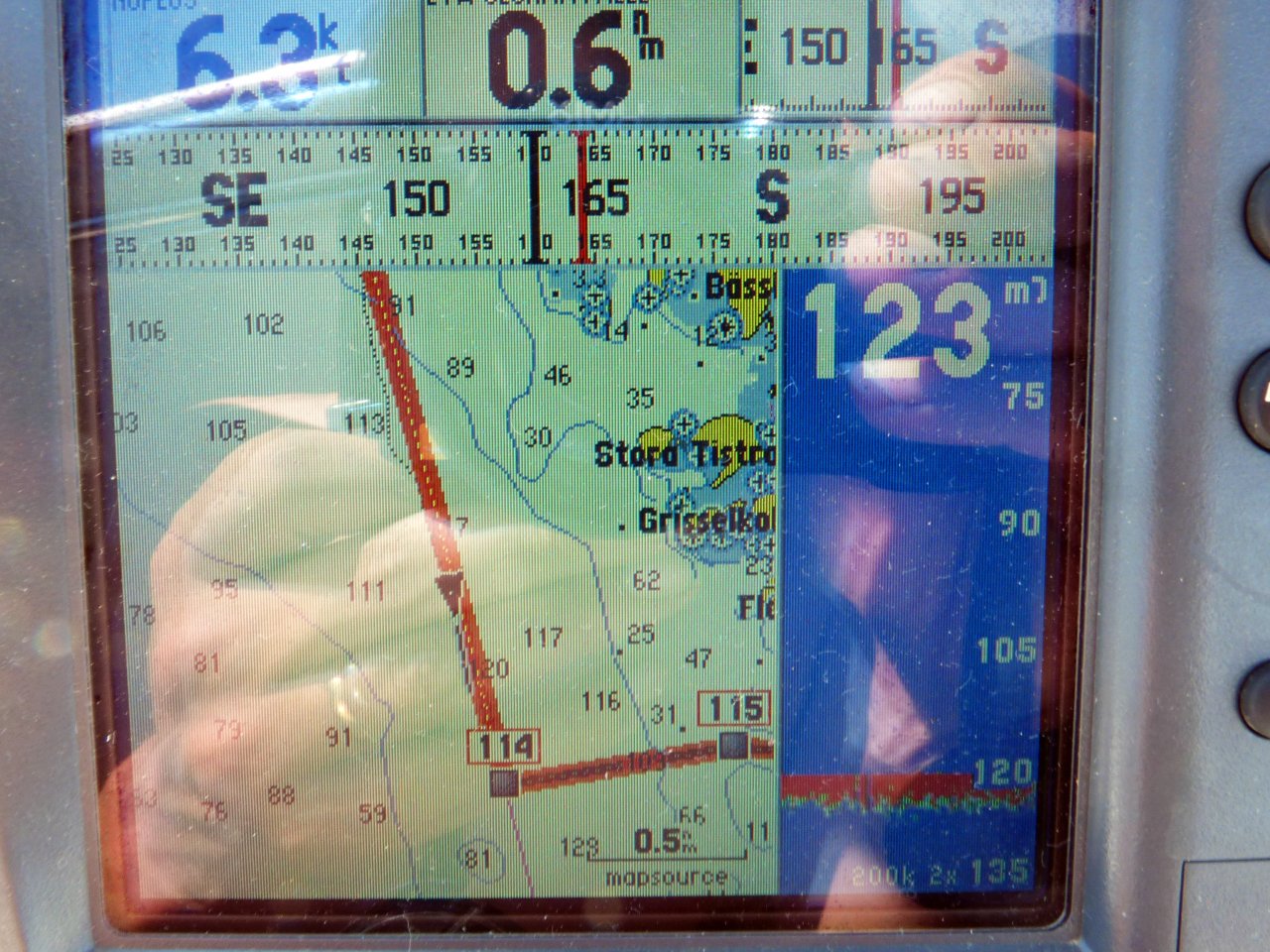 ..että jatkoimme saaren ohi länsipuolelta avomerelle. Vettä piisasi kölin alla.