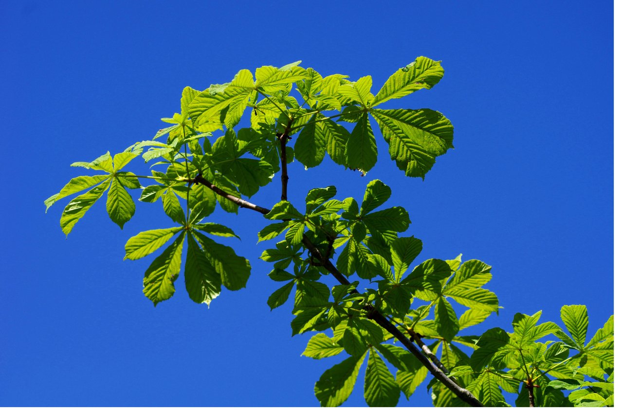 Aurinko paistaa hevoskastanjan läpi.