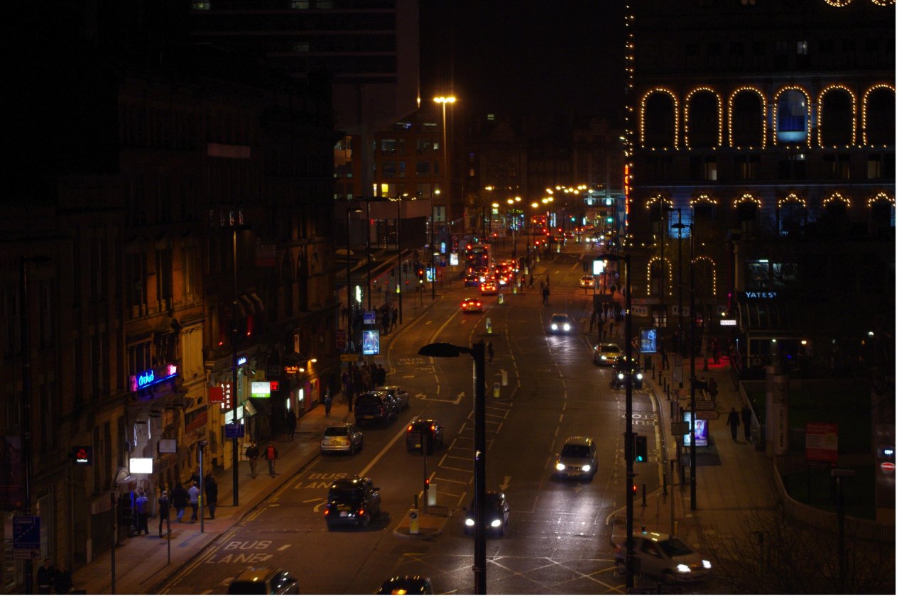 Näkymä hotellihuoneen ikkunasta kadulle, jossa paikallinen anarkistinuoriso osoittaa kapinallisuuttaan ajamalla väärällä puolen tietä.