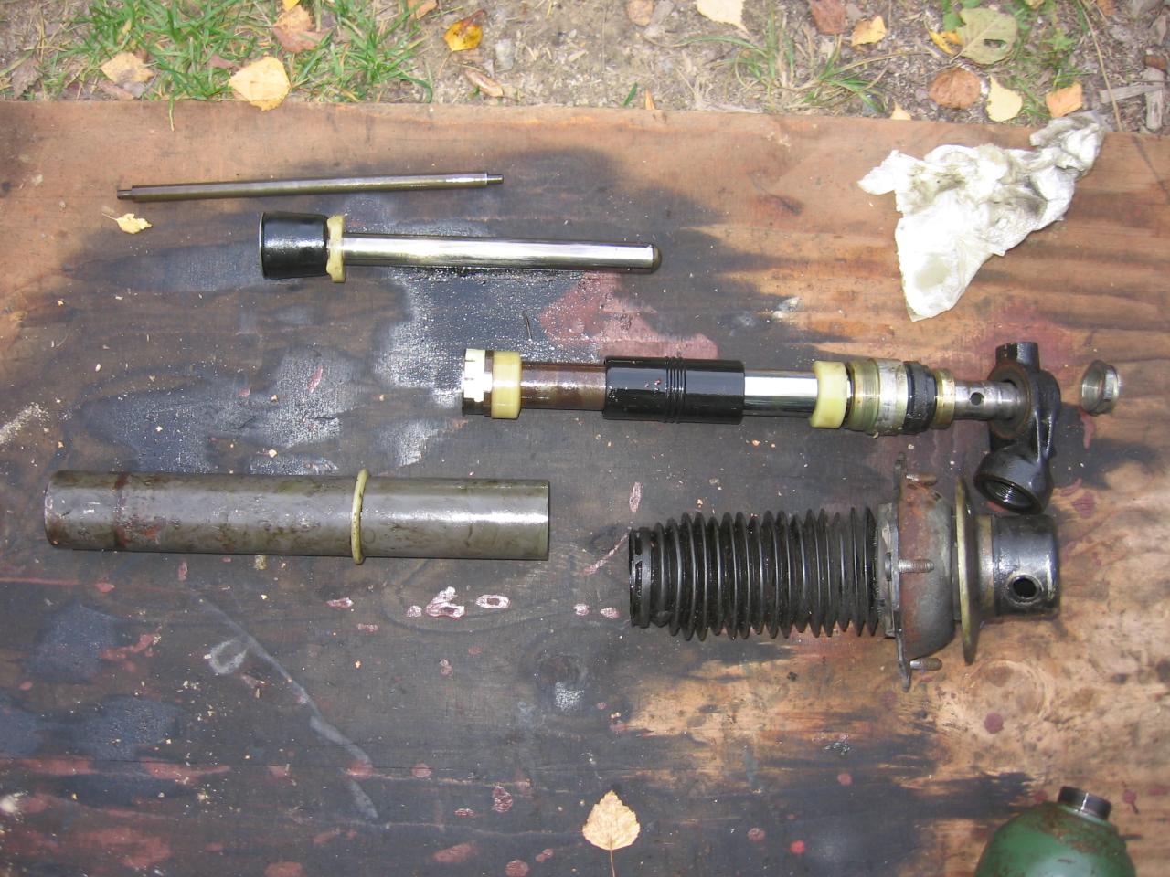 Jousitolpan osat. Alinna ulkokuoret, seuraavalla rivillä varsinainen sylinteri liitosyksiköineen, sitten mäntä ja ylinnä männän sisällä oleva ohjaintappi. Yläasennossa paine nostaa jousituksen sylinterin ympärillä olevaa pitkää kumiholkkia vasten, ala-asennossa auto makaa männän ympärillä olevan kumiholkin päällä.