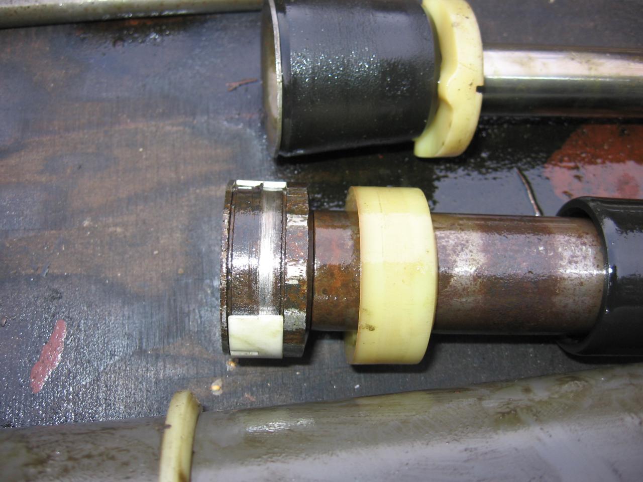 Ensimmäinen havaittu vaurio on sylinterikappaleen alapään holkissa oleva muovirengas, joka on poikki. Tämä selittää sen, että hydraulinestettä pulppusi moottorin sammutuksen jälkeen joustintuen yläpäästä keulan vajotessa.