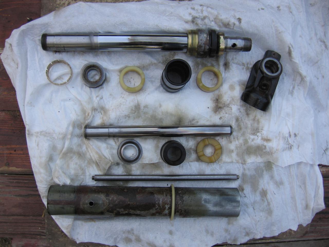 Irrotetaan ja puretaan vertailun vuoksi toinen etutolppa. Tämä oli ollut kuukausikaupalla ajossa toinen paluuletku poikki ja haitarikumi puhki, ja sen jälkeen kolme vuotta seisomassa, mutta näyttää selvinneen vähemmällä korroosiolla kuin edellinen.