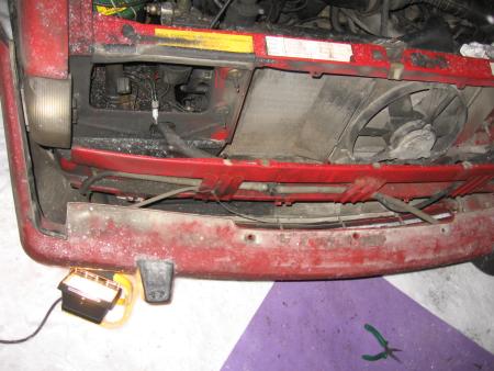 Styyrpuurin puolelta puskuri ei venynyt riittävästi, joten se joudutaan irrottamaan reilummin. Homma onnistuu vetämällä puskurin takanurkkaa sivulle päin irti lokarista ja samalla voimakkaasti eteenpäin. Klemmareiden kohdalta autetaan vähän ruuvimeisselillä.