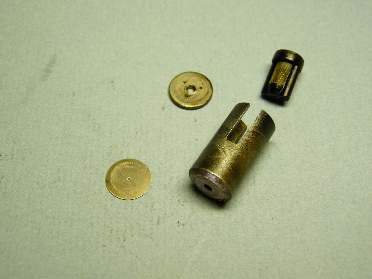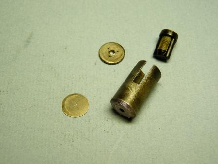 ...paineenvaraajalta tulevan linjan suodattimen tulpan jälkeiset osat: kuristinlevy, jossa isompi kartiokas reikä, suodatin, suodattimen pidike ja kuristinlevy, jossa vajaan puolen millin reikä.