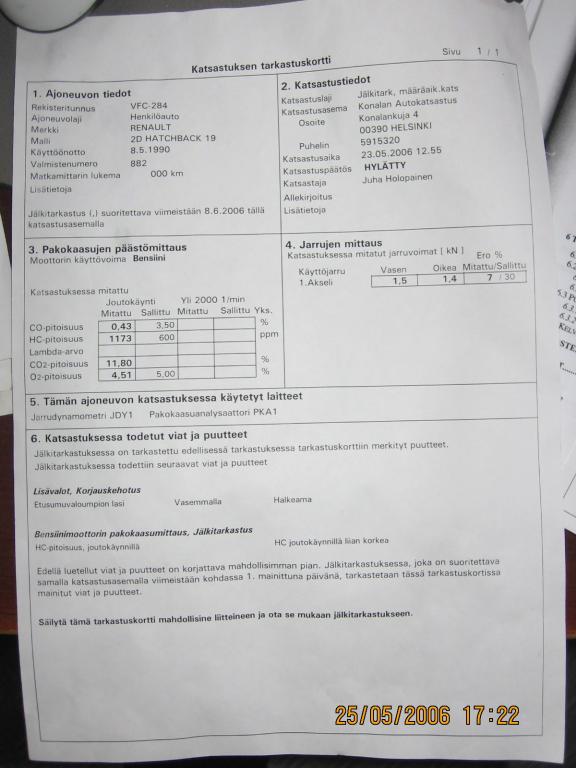 Rellun katsastuksessa mitattiin tyhjäkäynnillä liian korkea hiilivetyarvo, vaikka seos oli laihalla. Ensimmäinen yritys eli tulpanjohtojen ja tulppien uusinta ei auttanut. Tarkemmalla haulla havaittiin, että ykkössylinterin puristukset ovat n. 7 kilon luokkaa, kun muissa arvot olivat välillä 11-13 kiloa. Primääriviaksi arvellaan imusarjan tiivisteen vuotoa, joka on laihentanut ykkössylinterin seosta ja ennen pitkää aiheuttanut venttiilivaurion. Asia pitää tarkistaa ottamalla kone auki.