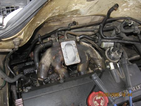 Kaasutin täytyy irrottaa, jotta päästään käsiksi imusarjan kiinnitysmuttereihin. Ilman paineilmaräikkää imusarjan irrotus olisi ollut kova urakka.