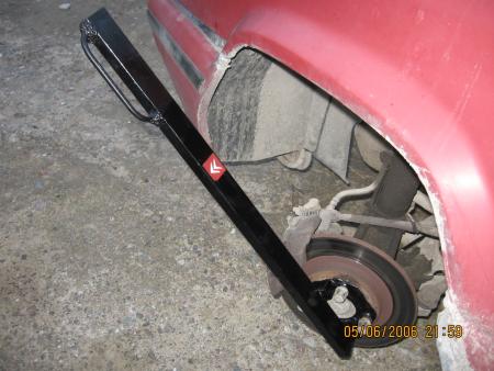 Ongelman ratkaisu: omatekoinen Citroen tool 6310-T, raaka-aineinaan vanhasta vanteesta irti rälläköity keskiö ja pätkä kirjahyllyn jalkaa.