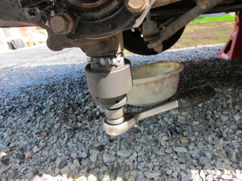 Pannaan mutterin ympärille 46 mm iskulenkki, pyörännapaan vanhasta vanteen keskiöstä ja kirjahyllyn jalasta hitsailtu vastaanpitotyökalu, ja kopautetaan moskalla nivel auki.
